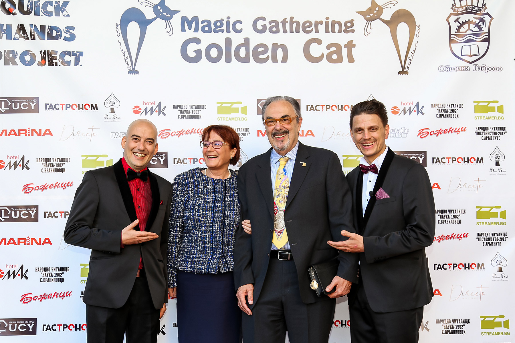 * На снимката (отляво надясно): Мистър Джим от Quick Hands Project, съпругата на Доменико Данте, Доменико Данте - президент на международната организация на магичните общества, Дани Белев - оргазниатор на ЗЛАТНА КОТКА