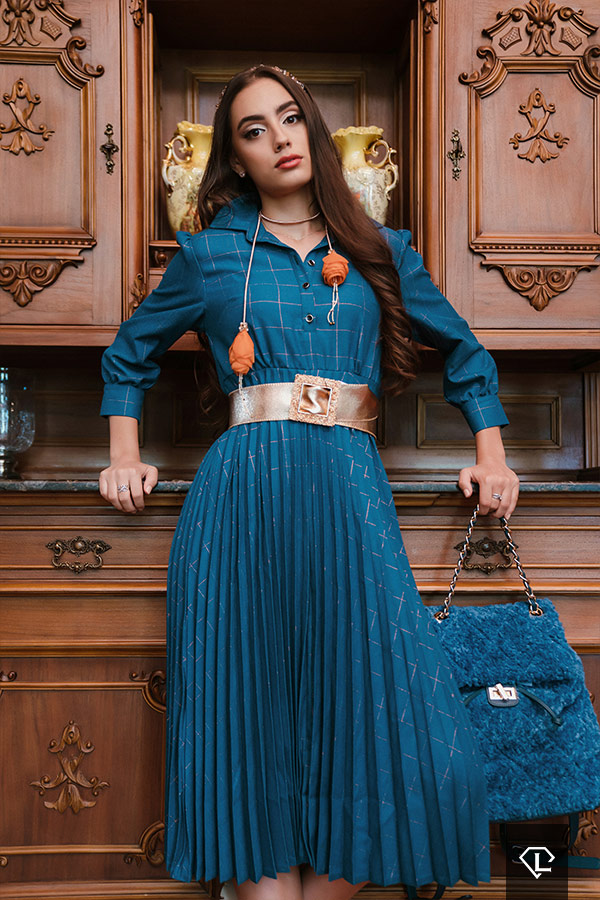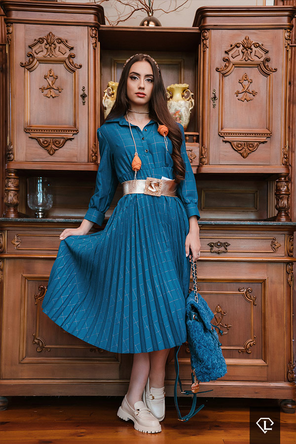 Елегантна рокля в наситен, син цвят за сезон есен/зима с бляскави акценти.