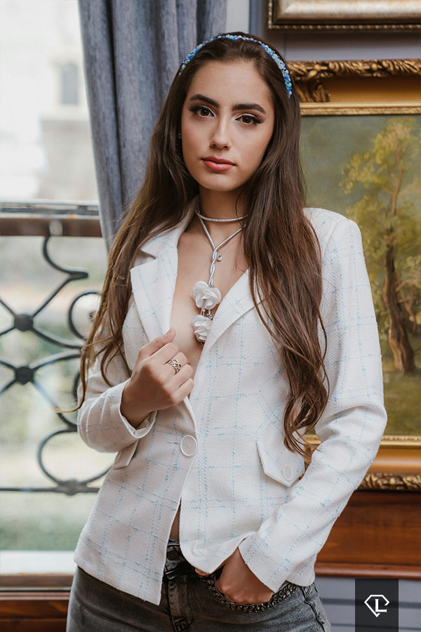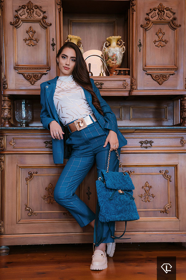 Сет, издържан в духа на френската мода с акценти в актуалния за сезона десен, подобен на пепит. Блейзерът е къс и втален, а панталонът е с колан и висока талия. Топ с принт, който партнира чудесно с блейзера и панталона.