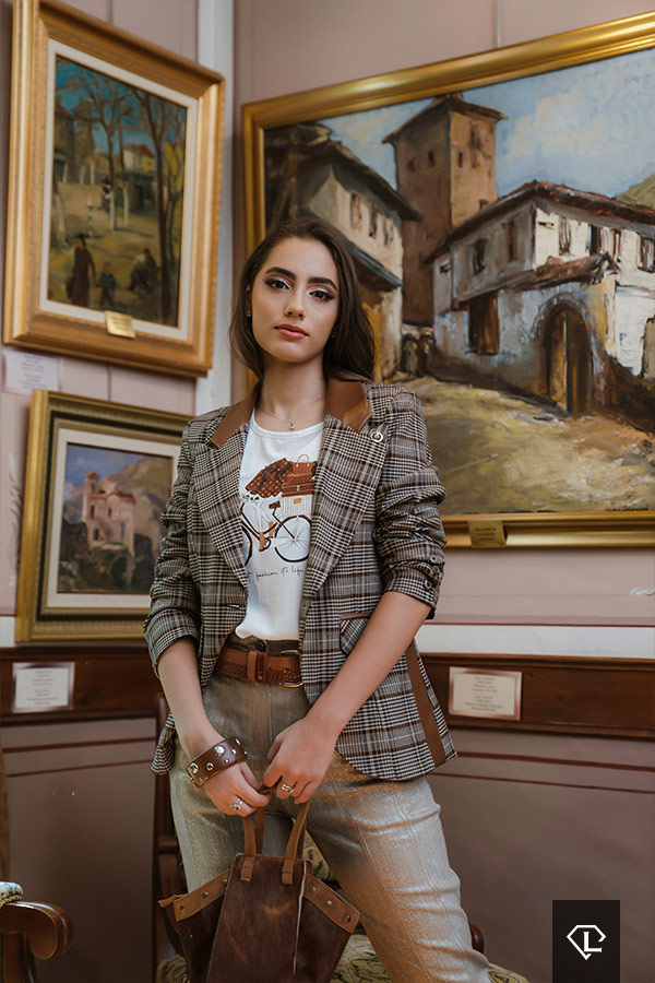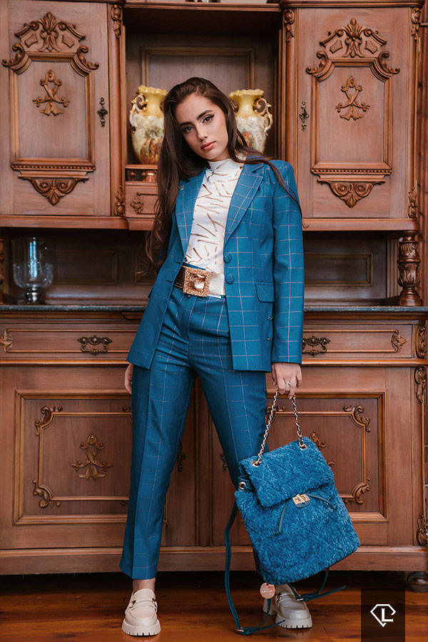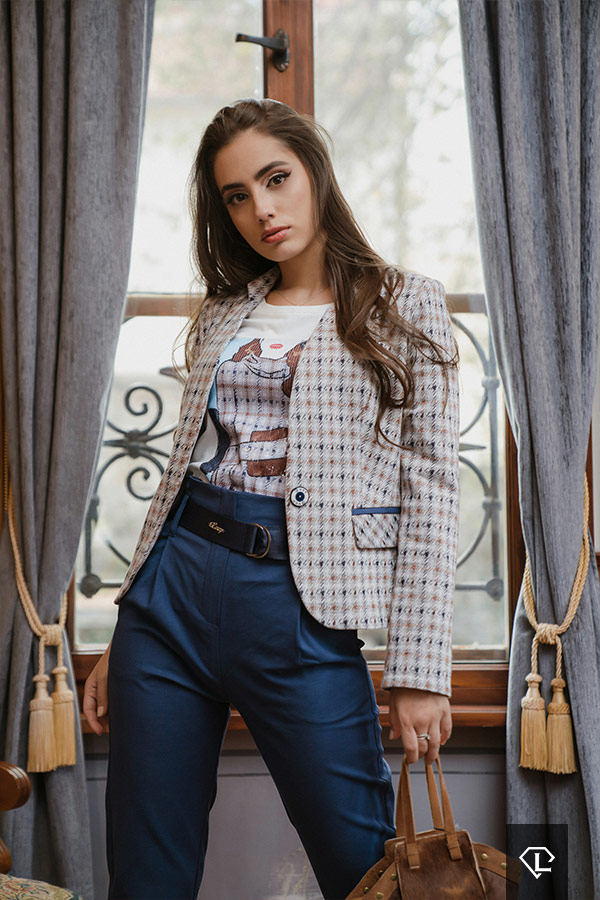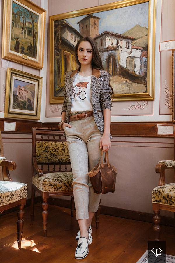 Комбинация, вдъхновена от сърцето на Англия! Строго карирано сако, което освежихме с панталон от бляскава материя и топ със закачлив принт.