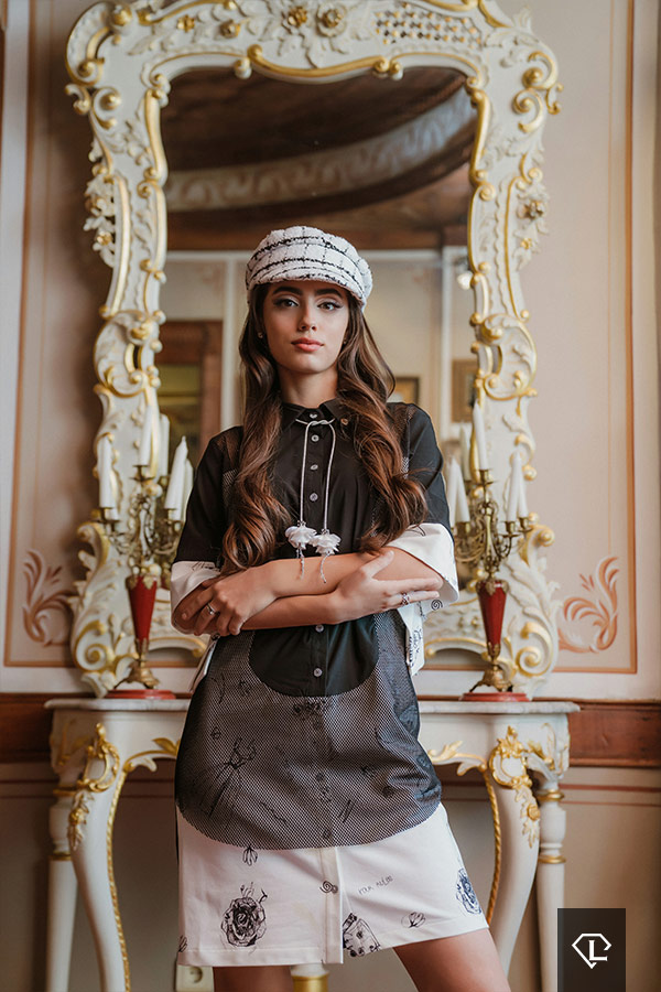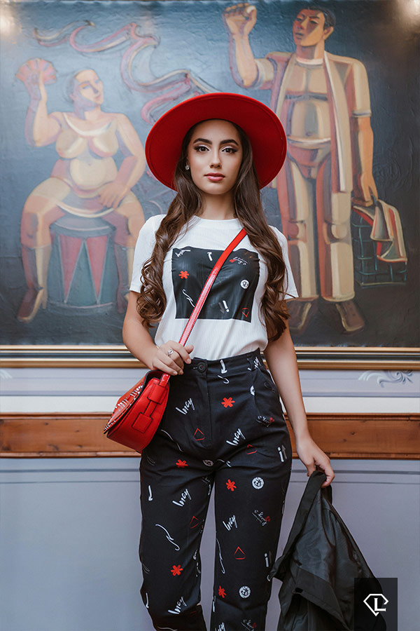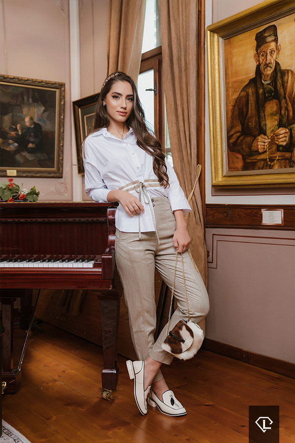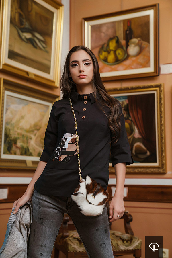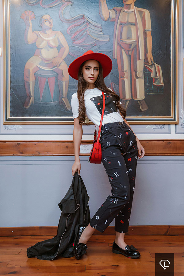 Фаталната жена винаги предизвиква, изненадва, съблазнява с начина, по който носи дрехите си! Черен панталон с висока талия, съчетан с бяла риза с fashion принт, тясна остра яка и пищни, широки ръкави, о-la-la!