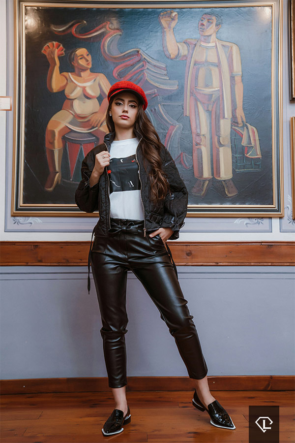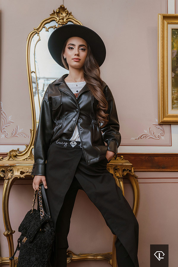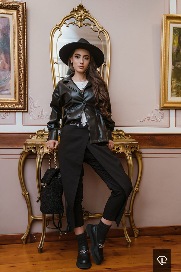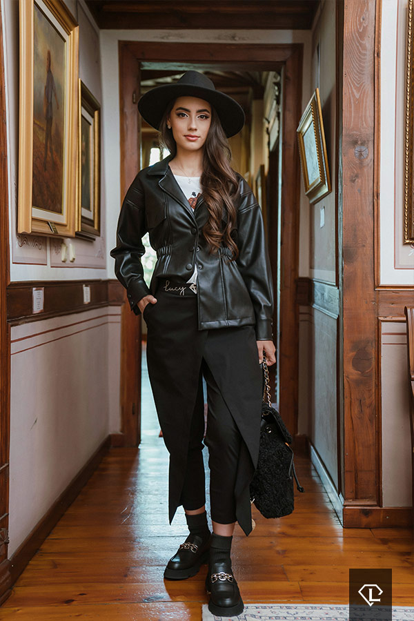 Дръзко яке от еко кожа, което съчетахме с тренди панталон с прехвърляне. Комбинирай с удобни ниски обувки и шапка!