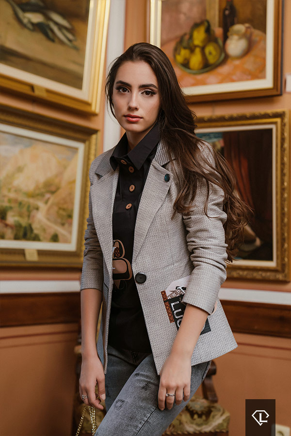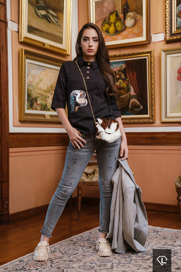 Дизайнерска риза с висока яка и апликация, съчетана с дънки в сиво - комбинация за всеки ден, в която ще се влюбиш! Съчетай със сакото със същия принт под номер 13 в нашата колекция.