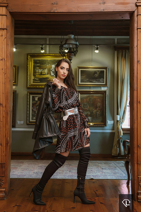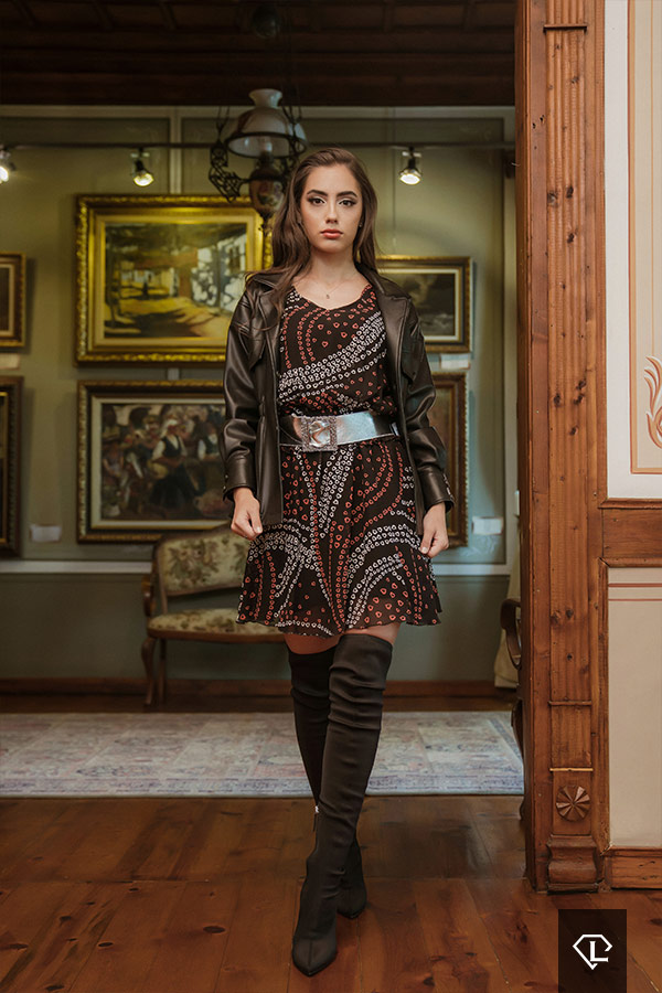 Ако си влюбена в топлите цветове на есента и дрехите, които подчертават женствеността, избери комбинацията Тъмна есен / Аutomne sombre. Късата, елегантна рокля в есенна гама си партнира невероятно добре с кафявото яке от еко кожа.
