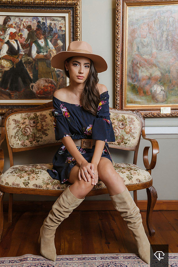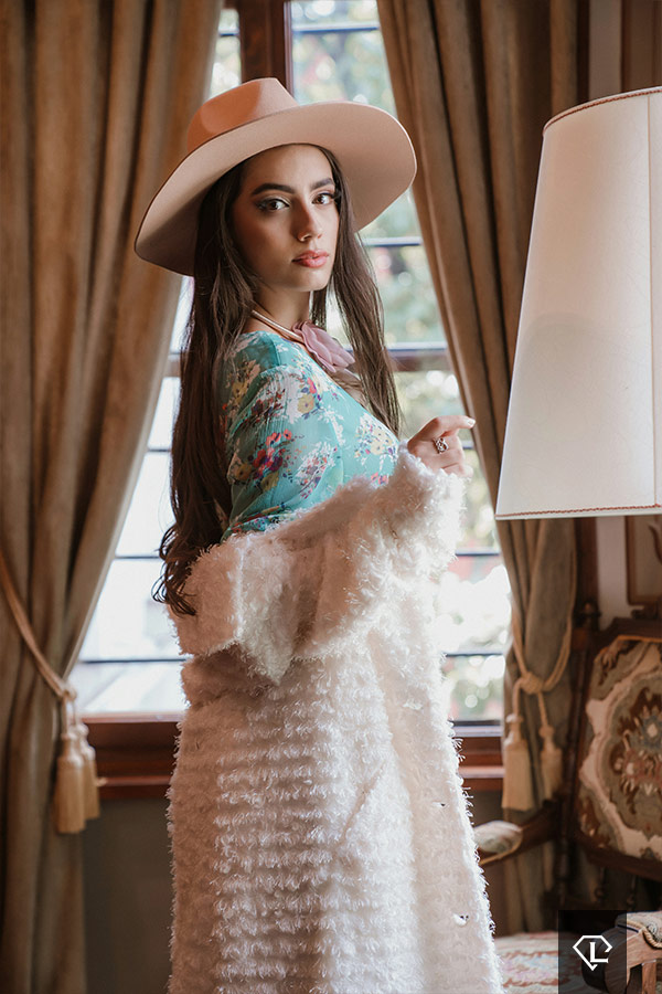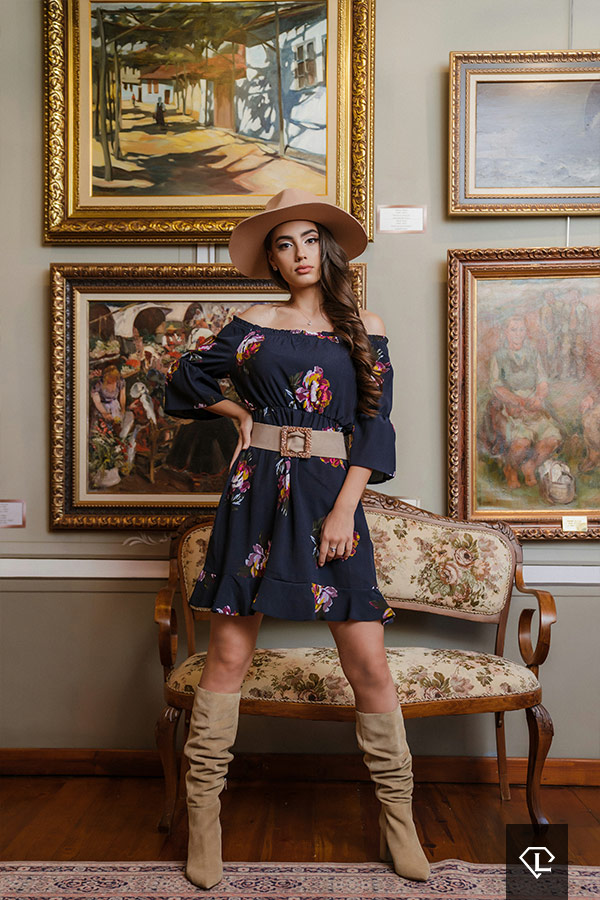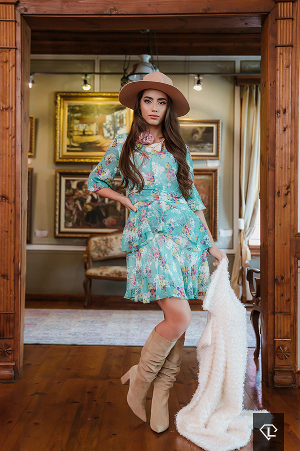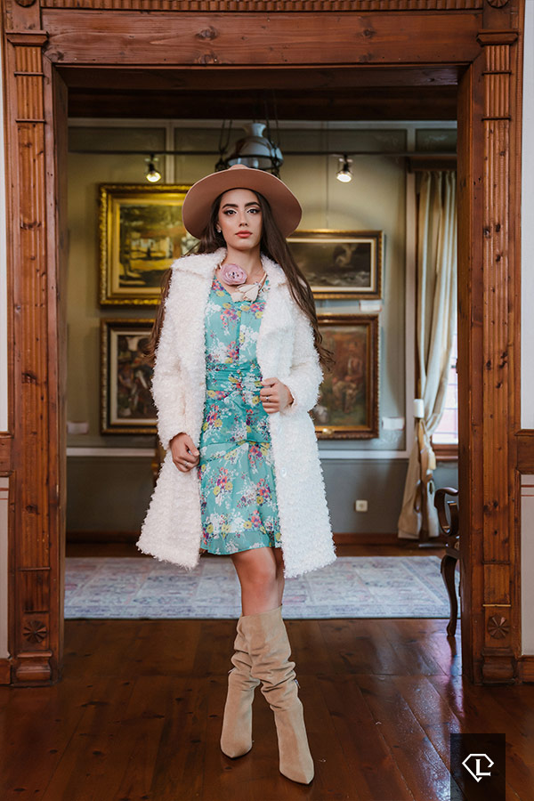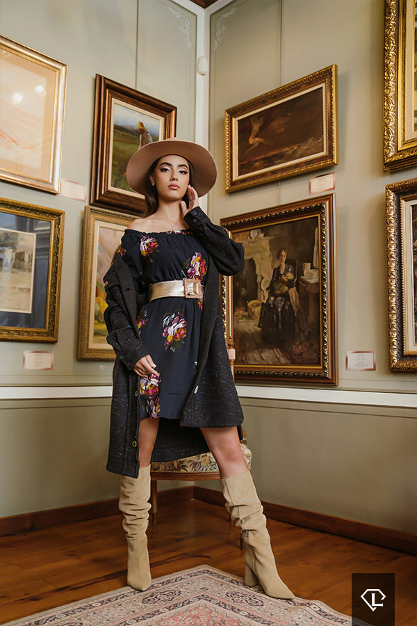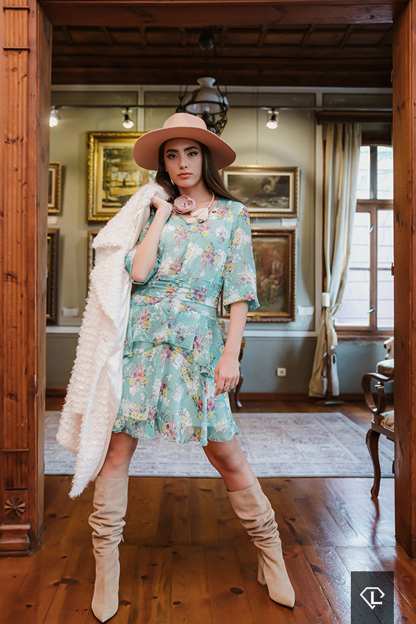 Нежна къса рокля с елегантен флорален десен за официални поводи. Съчетахме я с пухкаво палто, което може да разгледате под номер 18 в нашата колекция.