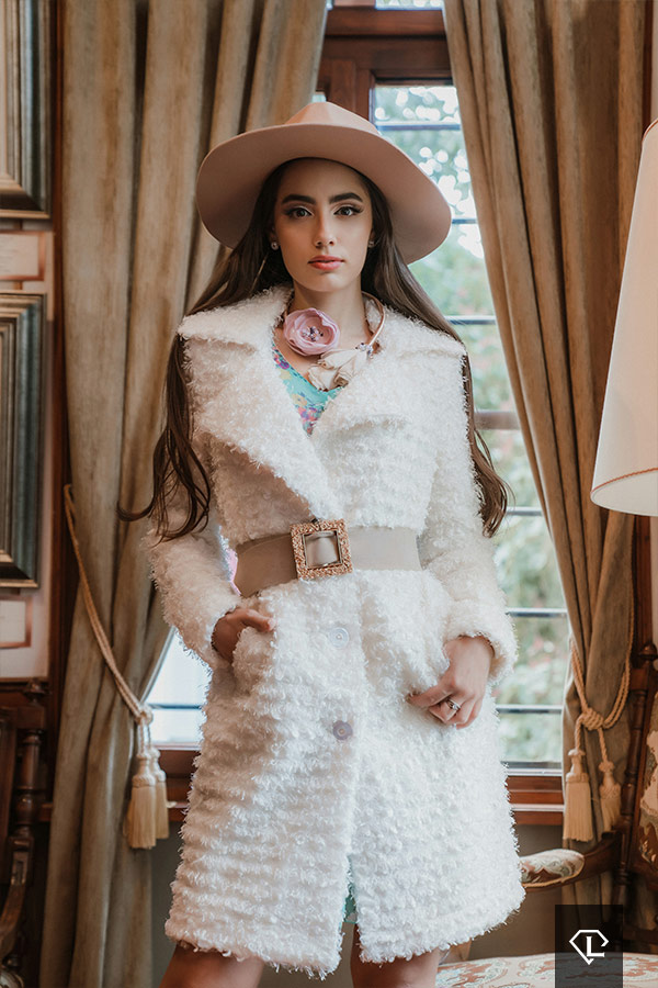 Елегантно, пухкаво бяло палто, подходящо за есента и пролетта. Комбинирахме с рокля Fleurs под номер 17 от нашата колекция.