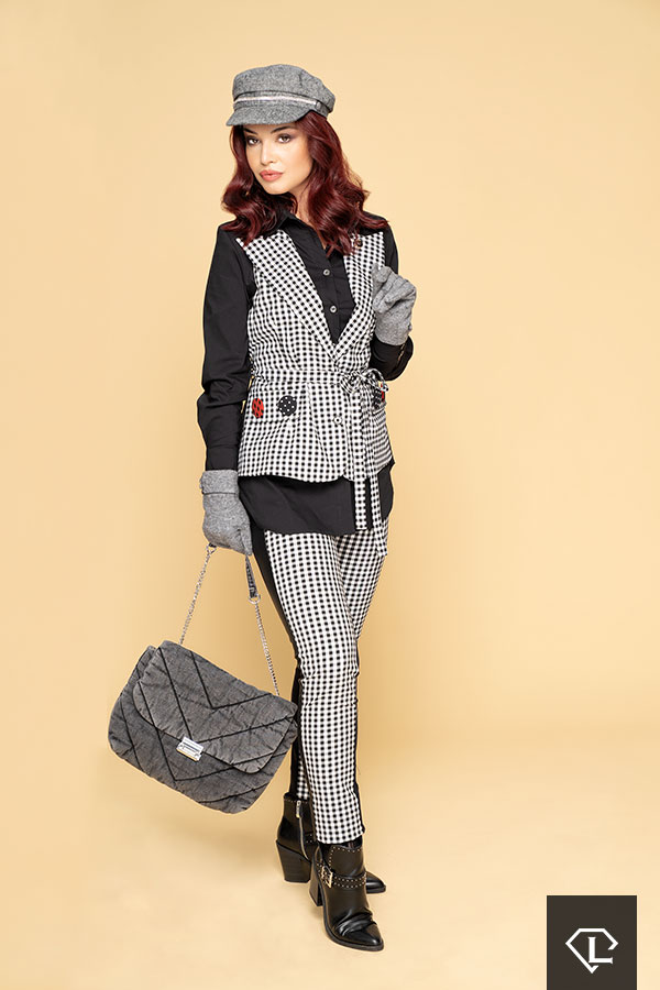 Комбинация от риза и панталон, които може да закупите заедно или отделно. Ризата имитира елек с коланче (задължително вижте гърба, когато посетите нашия бутик!), а панталонът е удобен и еластичен.