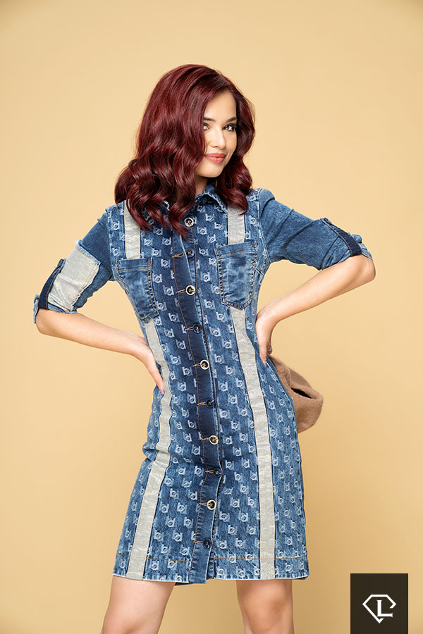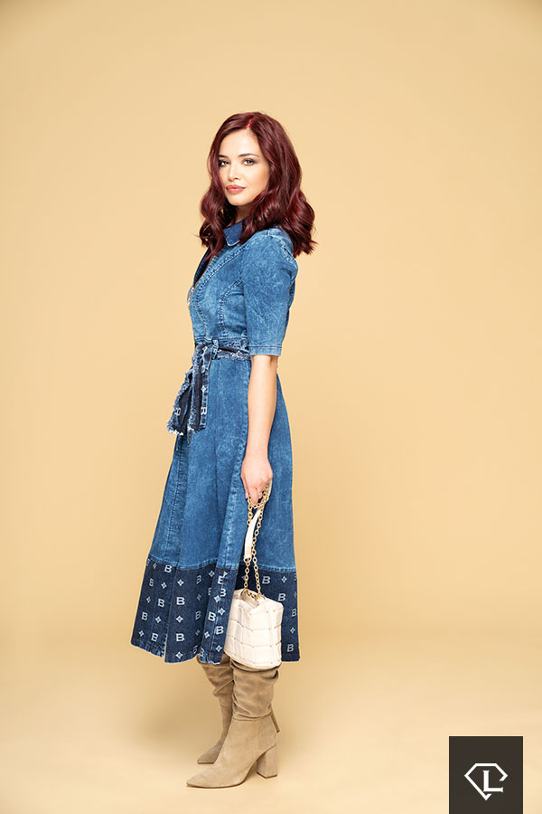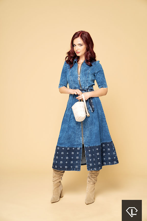 Еластична рокля от деним-жакард с релефни букви и предно закопчаване. Едновременно елегантна и удобна!