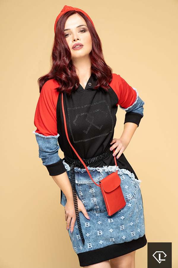 Ризката е от памучен деним с тренди апликация, а панталонът е от тъмносин деним.