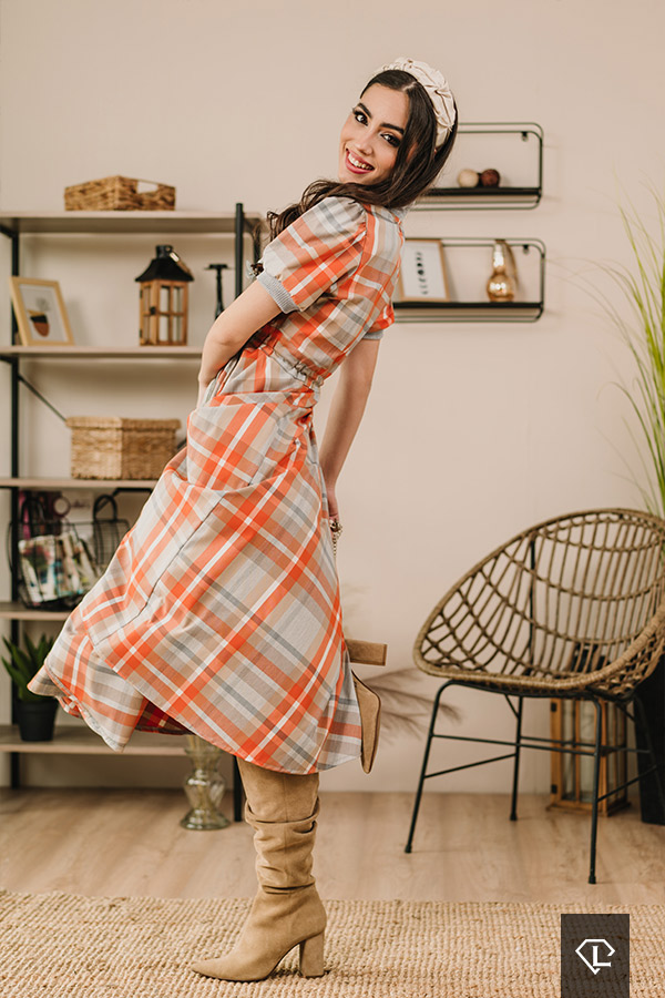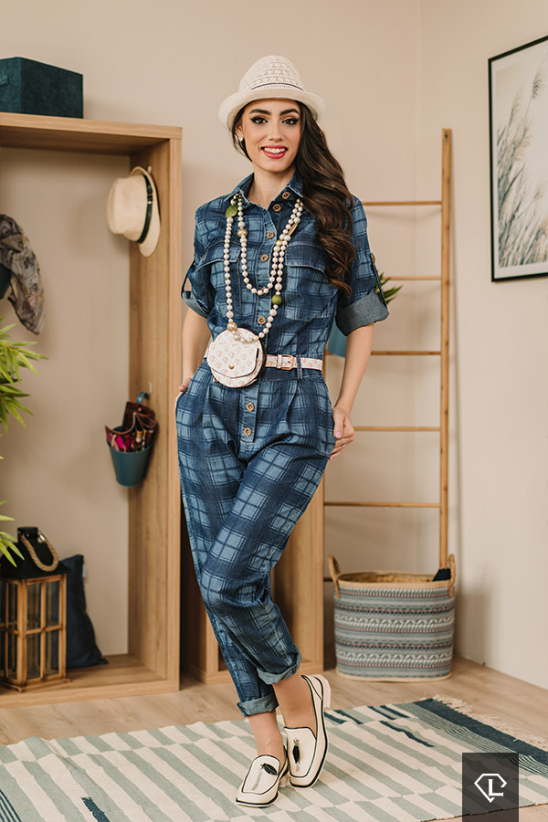 Гащеризон в красив кариран десен в цветовете на денима. Предно закопчаване с копченца.