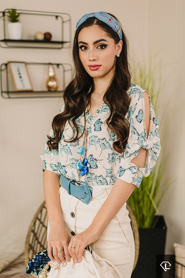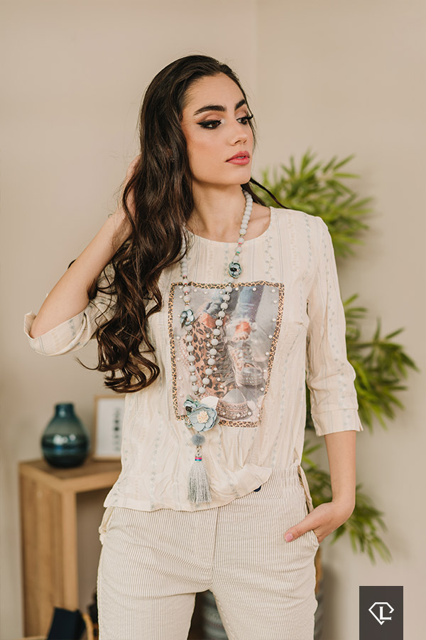 Прекрасен десен, приятна материя и закачливи панделки на гърба - този топ ще те грабне! Разгледай панталона, с който го съчтахме, под номер 9 в тази колекция.